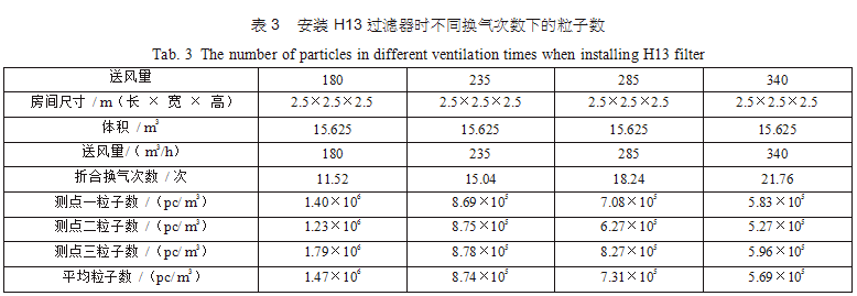 在空調(diào)機(jī)房中新建了三間2.5m×2.5m×2.5m的潔凈間,從空調(diào)主風(fēng)管引風(fēng),每支支管設(shè)置調(diào)節(jié) 閥,并設(shè)排風(fēng)機(jī)進(jìn)行全排,送回風(fēng)口及測點(diǎn)布置分別如圖 3(每點(diǎn)取樣三次,取平均值)??紤]到初中效過濾器對最后潔凈度的影響和最后理論塵埃數(shù)量 計算的方便,試驗用初中效繼續(xù)分別為G4、F8,三個房間分別安裝高效過濾器,風(fēng)量500m3/h,第一組數(shù)據(jù)為送風(fēng)量按GMP 驗證指南推薦換氣次數(shù)保持不變,分別用H12、H13、H14、U15過濾器,第二組數(shù)據(jù)為采用H13高效過濾器,調(diào)節(jié)風(fēng)量 ;第三組數(shù)據(jù)為采用H14高效過濾器,調(diào)節(jié)風(fēng)量,分別測得塵埃粒子數(shù),并列表得出不同的換氣次數(shù)下對應(yīng)的塵埃數(shù)如表2、表3、表4。